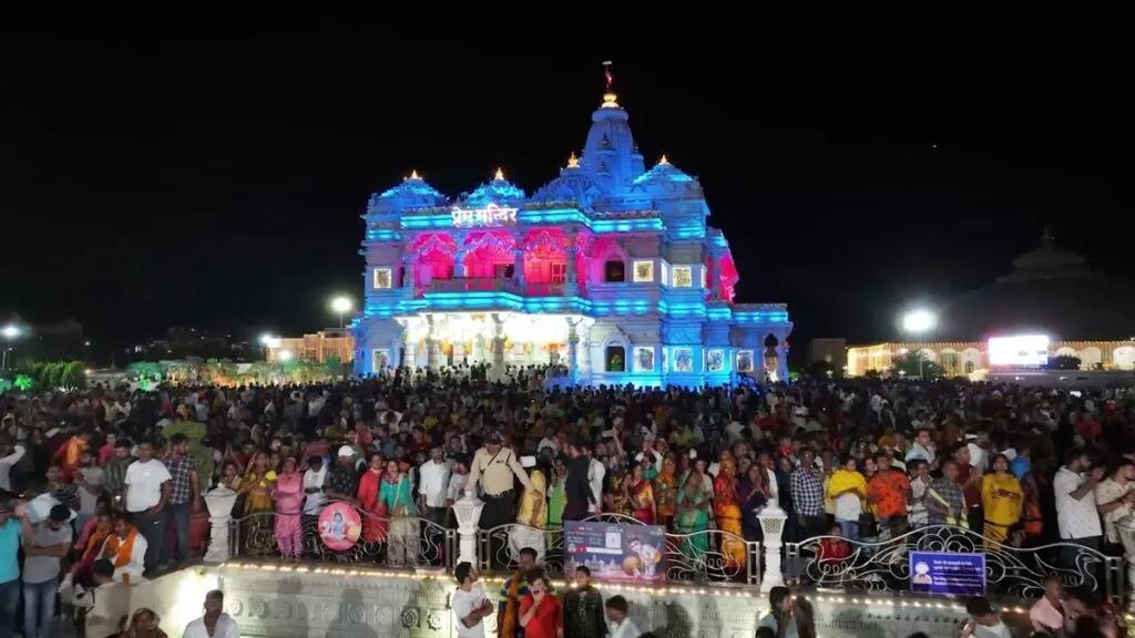प्रेम मंदिर, वृन्दावन में भक्तों की भारी भीड़।