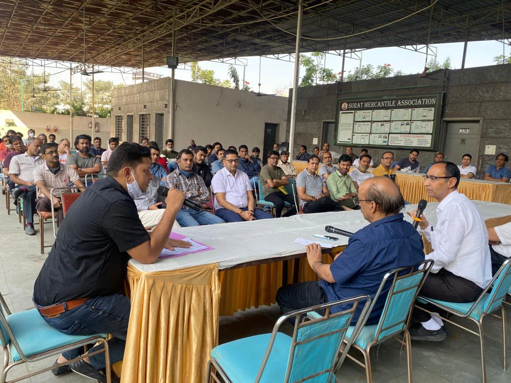 आज की मीटिंग में सूरत मर्कनटाइल ऐसोसिएशन के आज की मीटिंग में आत्माराम बजारी,सुरेंद्र जी अग्रवाल,महेश पाटोदिया,हेमंत गोयल, राजकुमार चिरानिया, मनोज अग्रवाल, संजय अग्रवाल, केवल भाई असीजा, अरविंद जैन, मुकेश अग्रवाल, दीपक अग्रवाल, गौरव भसीन, जितेंद्र सुराणा, राजीव उमर, संदीप जी गुप्ता,की उपस्थिति रही है।।