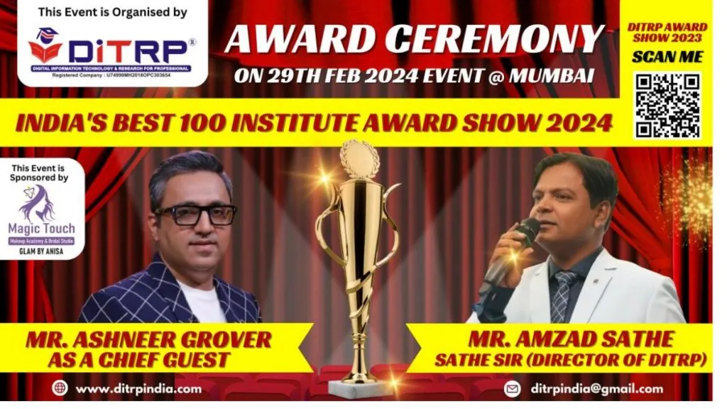 HELLO DIGITAL INDIA के सहयोग से डिजिटल इंफॉर्मेशन टेक्नोलॉजी एंड रिसर्च फॉर प्रोफेशनल्स (DITRP) 29 फरवरी को मुंबई में प्रतिष्ठित भारत के सर्वश्रेष्ठ 100 इंस्टीट्यूट अवार्ड शो 2024 में भारत के 100 सर्वश्रेष्ठ कंप्यूटर संस्थानों को सम्मानित करेगी। कोहिनूर कॉन्टिनेंटल होटल,अंधेरी ईस्ट।