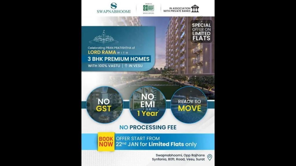 सूरत: सूरत के अग्रणी रियल एस्टेट डेवलपर ग्रीन ग्रुप ने सोमवार को अयोध्या में भव्य राम मंदिर की प्राण प्रतिष्ठा के उपलक्ष्य में एक विशेष योजना की शुरुआत की। योजना के अंतर्गत, अगले ३० दिनों में ग्रीन ग्रुप के वेसु स्थित स्वप्नभूमि प्रोजेक्ट में घर खरीदनेवालों को एक साल तक इएमआई (EMI) नहीं भरनी होगी तथा जीएसटी (GST) का भुगतान भी नहीं करना होगा।